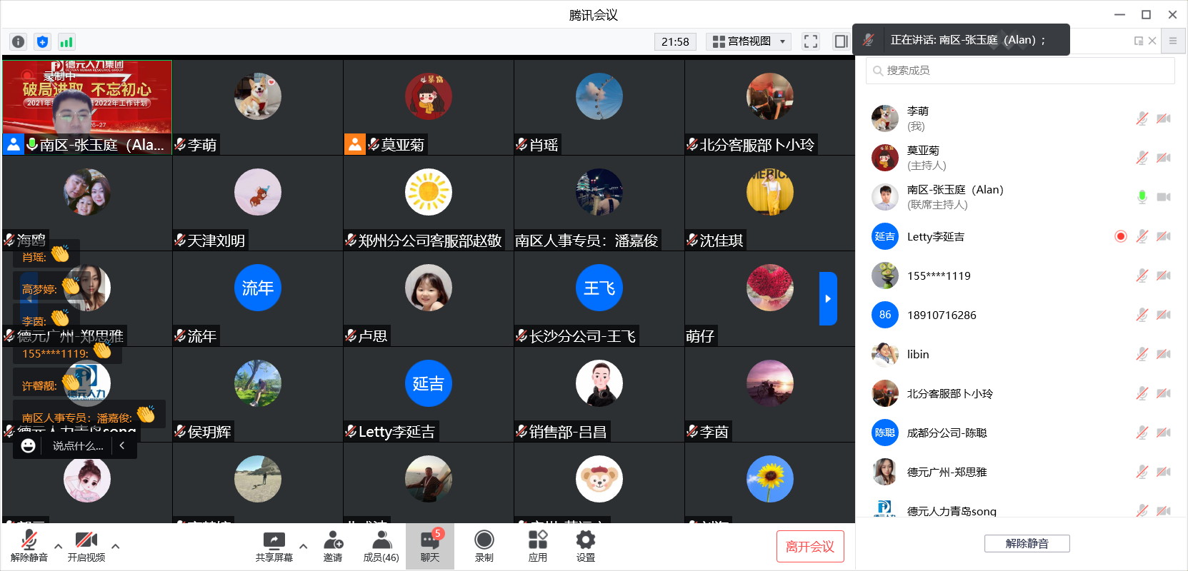 此次會議分別由南區(qū)人事經(jīng)理張玉庭先生和北區(qū)管理中心負責人李茵女士擔任主持工作,集團各部門負責人、各區(qū)域分公司負責人通過騰訊會議進行了線上工作匯報。針對2021年集團各部門、各區(qū)域分公司整體運營情況進行了總結(jié),回顧了過去一年工作中的主要成就,遇到的問題,以及應(yīng)對措施。同時為自己的團隊設(shè)立了2022年新的工作方向和目標計劃。